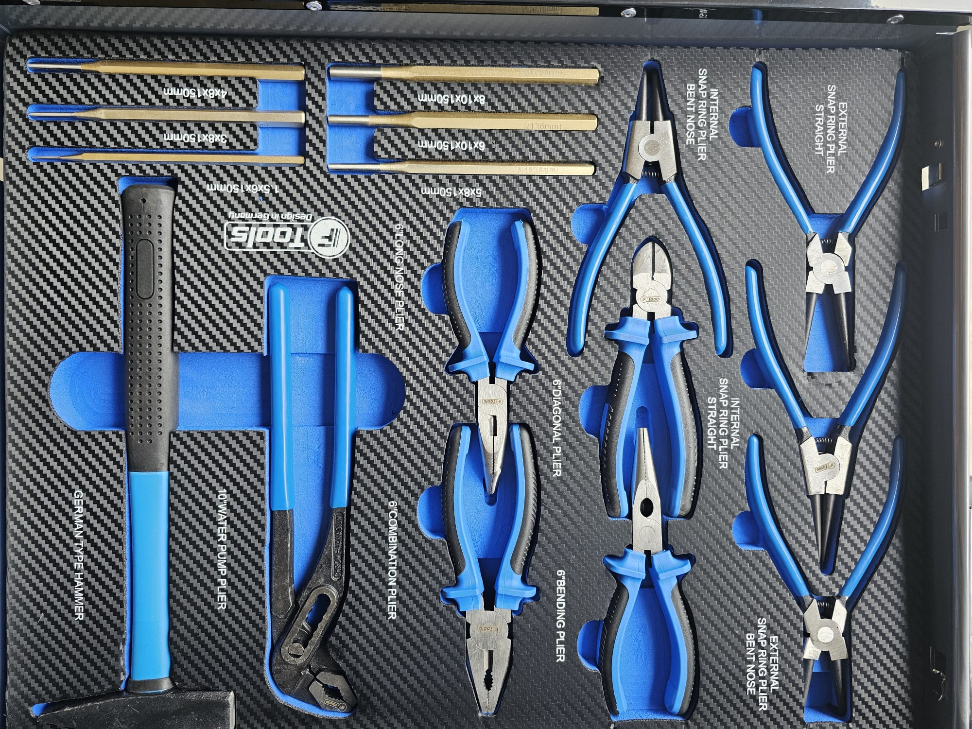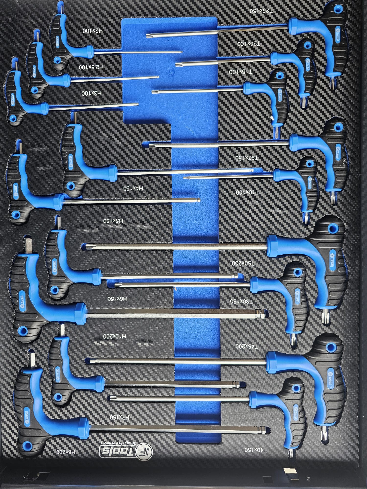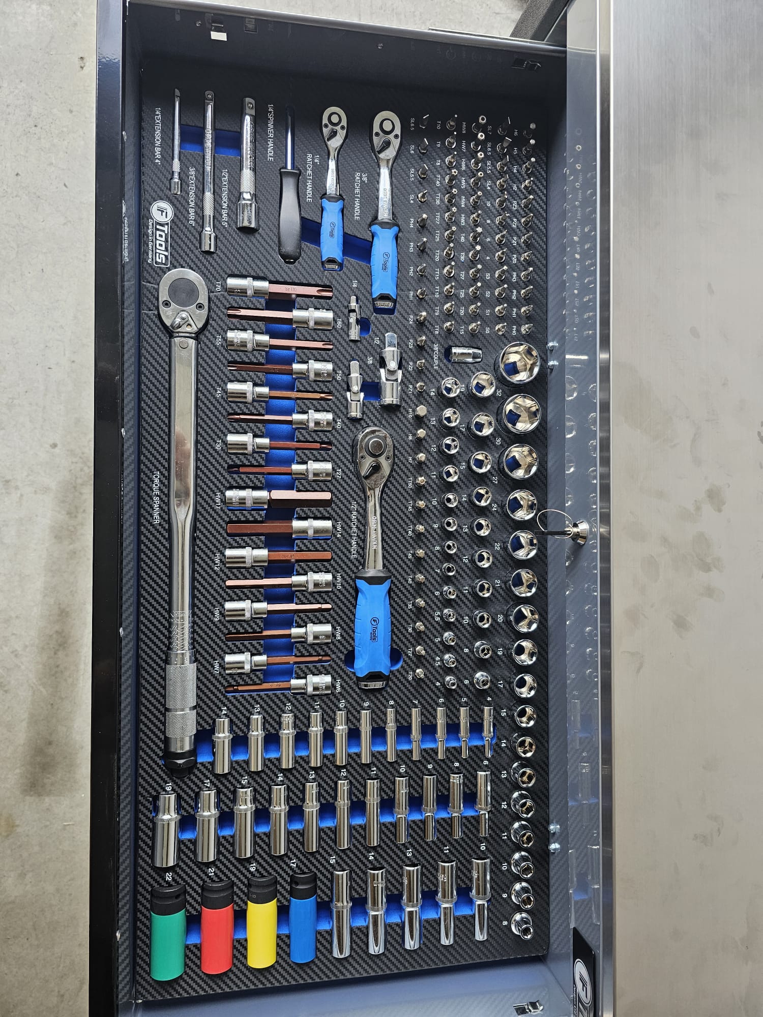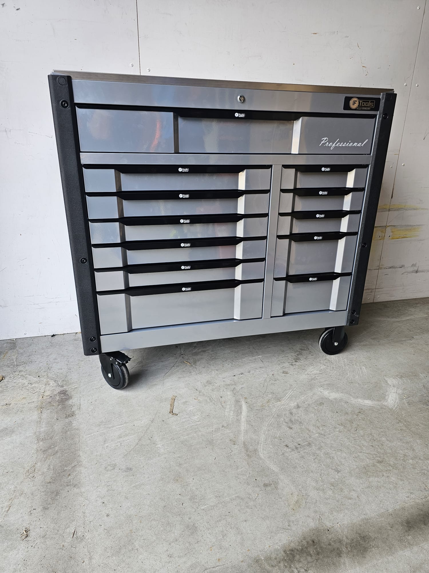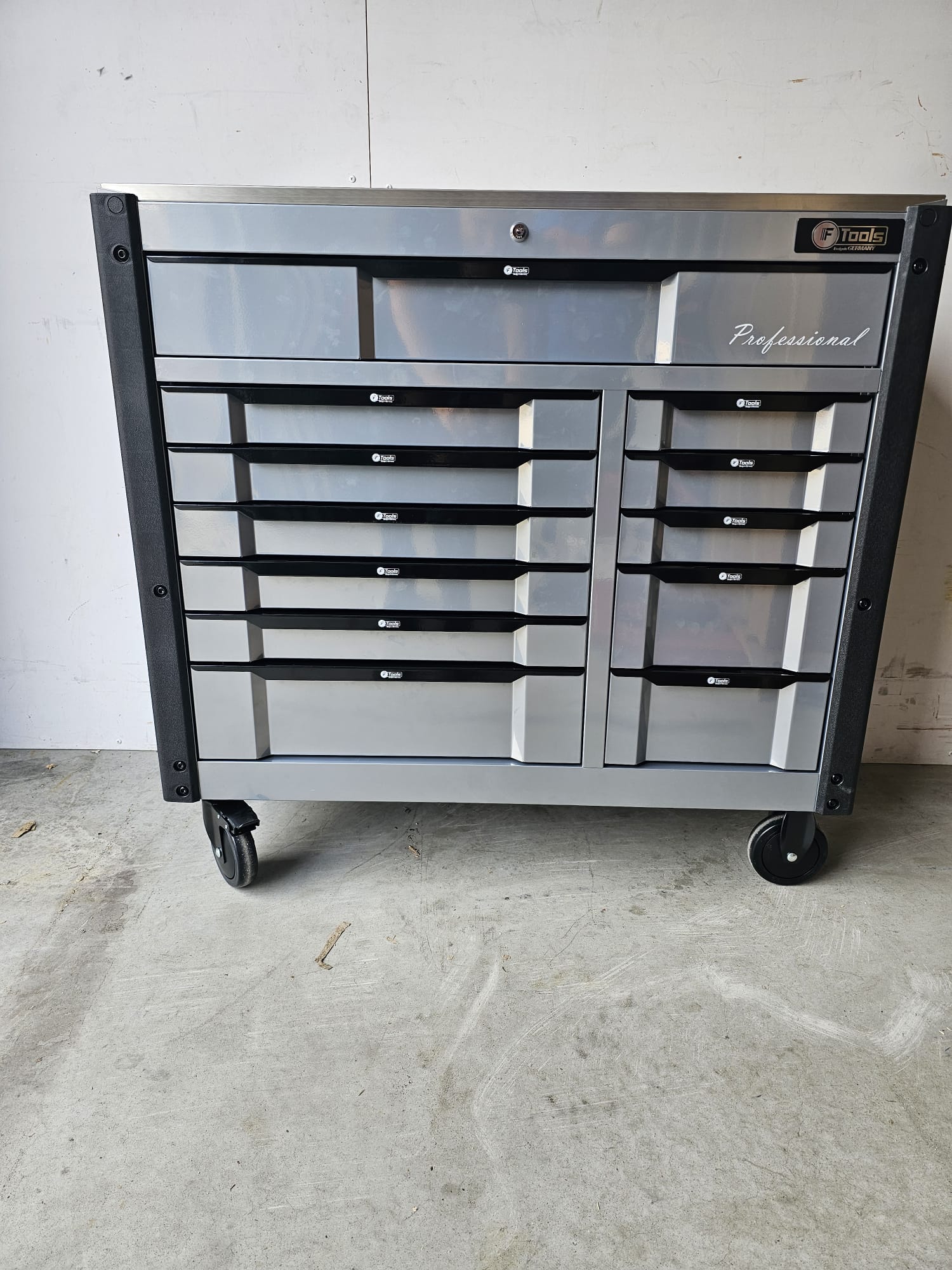 The FTools Tool trolley with 12 drawers is an indispensable tool for every professional workshop. With full extension drawers and a wide selection of professional tools, this cart offers both convenience and functionality. Whether you choose the all-metal version or the black version with blue accents, you are assured of a durable and stylish solution for your tool storage.